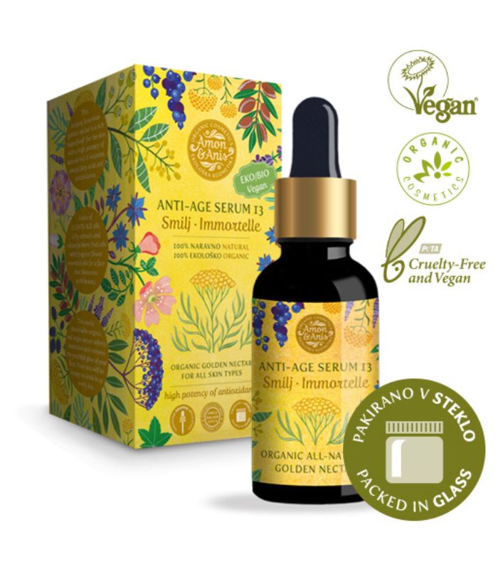 Amon & Anis ANTI-AGE serum 13 Smilj je ročno izdelan iz naravnih in ekoloških sestavin. Ustvarjalca slovenske kozmetike Amon & Anis sta s kombinacijo intuicije in znanja skrbno izdelala mešanico 13-ih popolnoma naravnih in ekoloških hranilnih olj, sodobnih CO2 ekstraktov in barvitih sadnih olj jagodičevja z dišečimi cvetnimi eteričnimi olji. Ta razkošni zlati nektar, ki med drugim vsebuje arganovo olje, CO2 ekstrakt šipka, rakitovca in granatnega jabolka ter eterična olja smilja, sadalovine in še mnogo drugih, je bogata superhrana za kožo. Vsebuje naravno prisotne vitamine A, C in E, omega maščobne kisline in antioksidante.