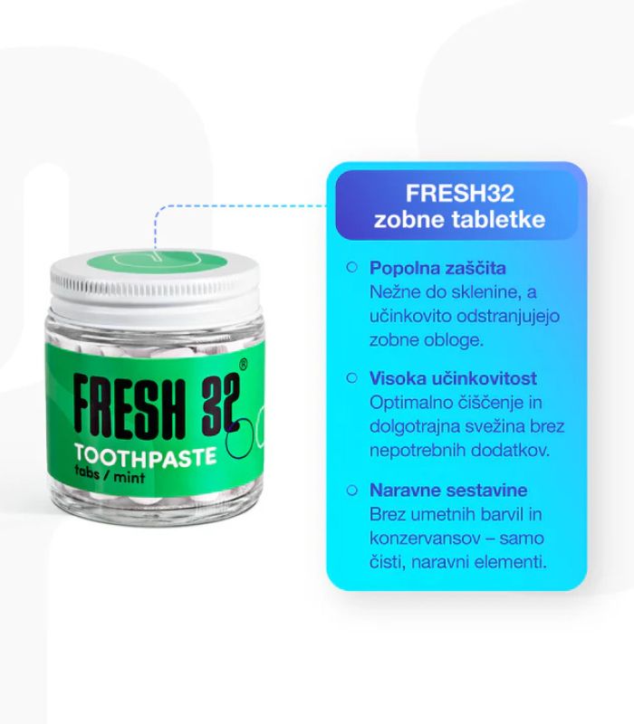Fresh 32 je slovenska znamka inovativne zobne paste v tabletkah, ki orje ledino na področju naravnih in naravni prijaznih zobnih past. Tabletke so alternativa klasičnim zobnim pastam v tubi in so okolju bolj prijazne, saj so pakirane v steklen lonček in se tako izognejo nepotrebni plastiki.